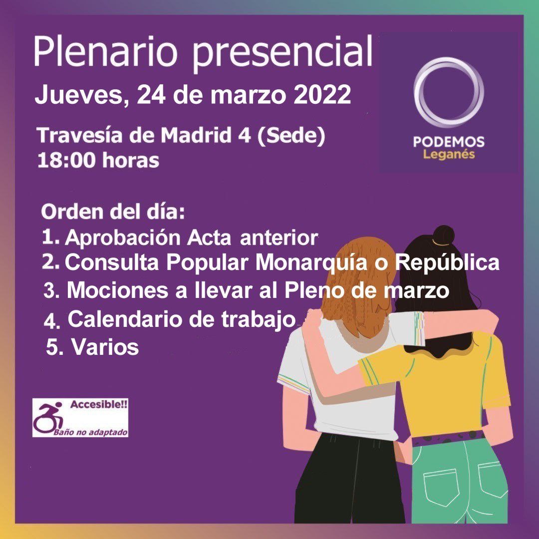 « Todos los Eventos Este evento ha pasado. Plenario 24 de Marzo 2022 24 marzo 2022 @ 18 h 00 min - 20 h 00 min « Convocatoria Asamblea/Plenario de 18:00 a las 20:30 horas. ACTO ALMUDENA SIEMPRE » Plenario 24 marzo 2022 Relacionado Añadir al calendario Google Calendar iCalendar Outlook 365 Outlook Live Detalles Fecha: 24 marzo 2022 Hora: 18 h 00 min - 20 h 00 min Organizador Podemos Leganés Ver la web del Organizador Local Sede Podemos Leganés Travesía de Madrid, 4 Leganés, + Google Map